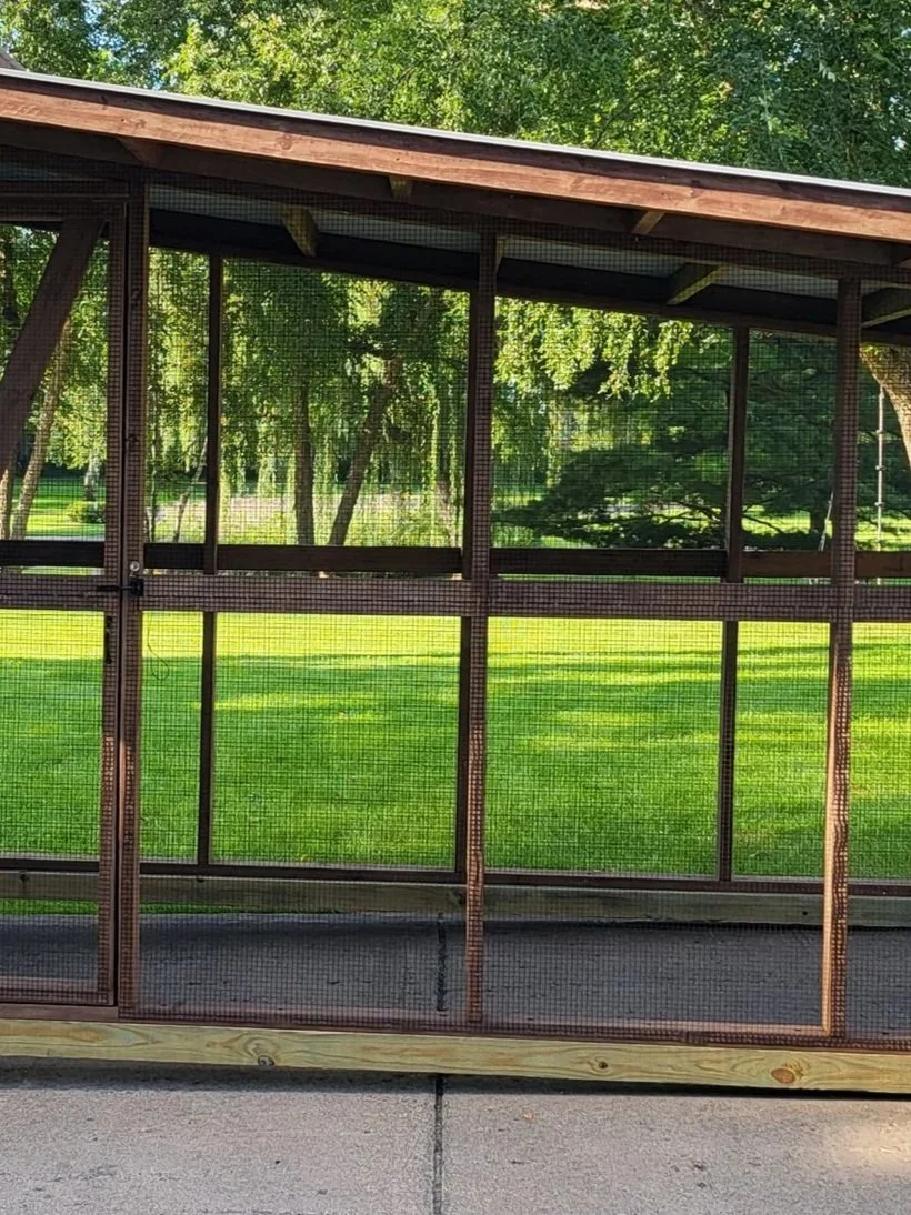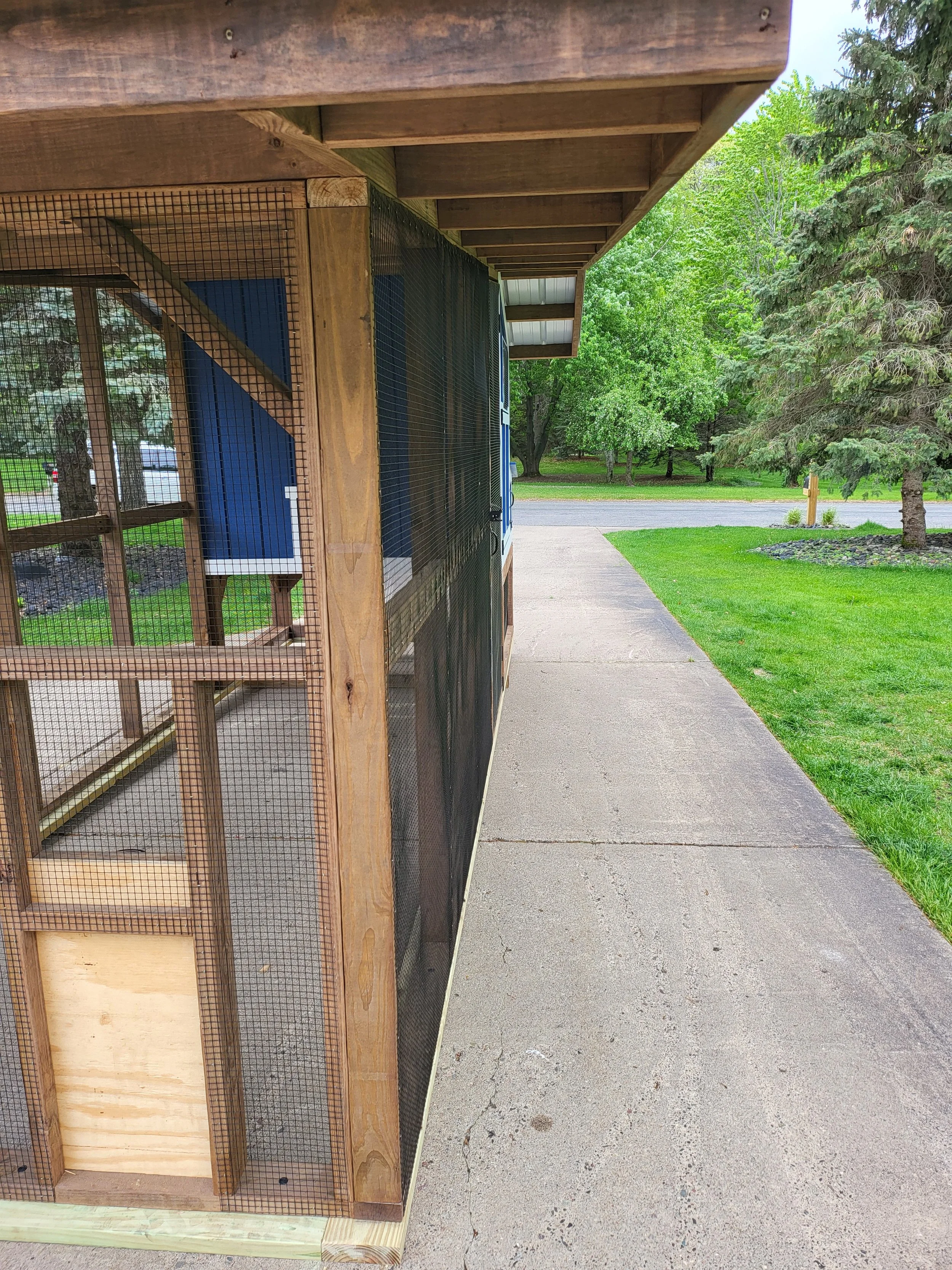 Generous roof overhangs shield the base of the coop and help keep the enclosed run protected from rain and runoff — especially during long stretches of wet Minnesota weather.